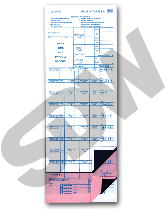 This Time Ticket is used mostly in import car dealerships. Has a hard copy on bottom, pink in center, pressure sensitive gummed white on top, with carbon paper inserted.